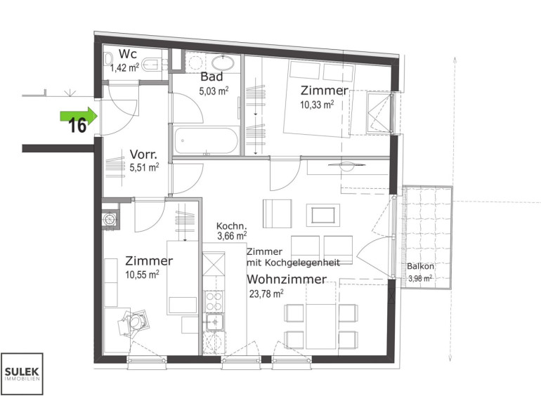 - Der südseitige Balkon ist über die Wohnküche zu begehen.