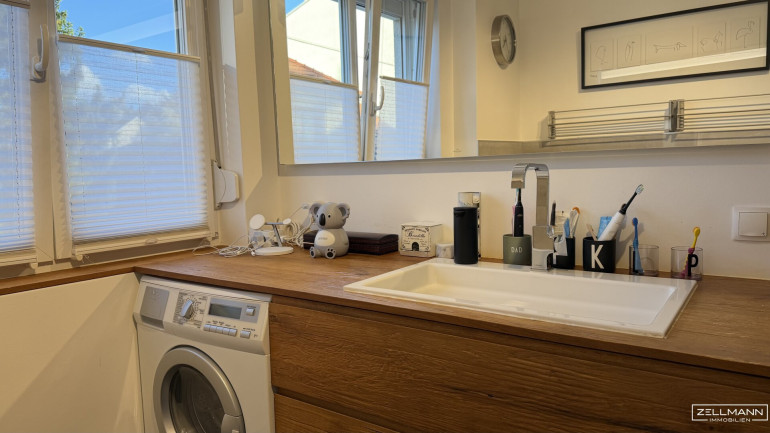 Das Wohn- und Esszimmer ist lichtdurchflutet und öffnet sich direkt zur großen Südterrasse, wodurch ein fließender Übergang zwischen Innen- und Außenbereich entsteht. Die modernisierten Nassräume präsentieren sich zeitlos, pflegeleicht und hochwertig. Insgesamt ergibt sich ein Wohngefühl, das sofort bezugsfertig ist und langfristig Wertstabilität verspricht.
