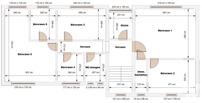 Auf einer Gesamtfläche von rd. 130 m² stehen mit eigenem Eingang 6 getrennte, klimatisierte Büroräumlichkeiten mit Größen von rd. 7 m² bis rd. 30 m², Sanitärbereich sowie eine komplett ausgestattete Küche zur Verfügung