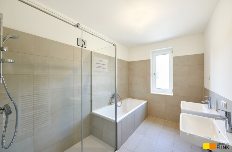 Im Obergeschoß erschließt der zentral angelegte Flur (ca. 6,44 m²) drei großzügige Schlafräume. Eines davon ist als Master-Bedroom (ca. 15,77 m²) mit Schrankraum geplant. Die beiden anderen Schlafzimmer weisen Flächen von ca. 12,42 m² und 12,65 m² auf. Ein lichtdurchflutetes Badezimmer (ca. 7,82 m²) mit Badewanne und Dusche, einem Doppelwaschtisch sowie einem Handtuchheizkörper finden Sie ebenso wie ein separates WC (ca. 1,98 m²) mit Handwaschbecken und einen zusätzlichen Abstellraum (ca. 2,81 m²).