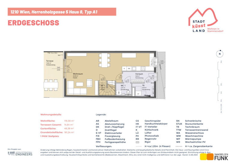 Das Reihenhaus 8 befindet sich in der Herrenholzgasse 5, 1210 Wien und wird auf einem ca. 161 m² großen Eigengrund errichtet. Seinen künftigen Bewohnern bietet es zudem eine komfortable Wohnfläche im Ausmaß von insgesamt ca. 117 m², angeordnet auf zwei Geschoßen mit 4 Zimmern, 2 Toiletten, einem großen Badezimmer, dem Technikraum und 2 Abstellräumen, sowie einer westseitig ausgerichteten Terrasse mit ca. 14 m², die sich zu einem ansprechenden Gartenbereich mit ca. 48 m² öffnet. Diesem Reihenhaus ist ein Parkplatz in unmittelbarer Nähe des Objekts zugewiesen. Der Kaufpreis für den KFZ-Platz beträgt 19.000,00 € .