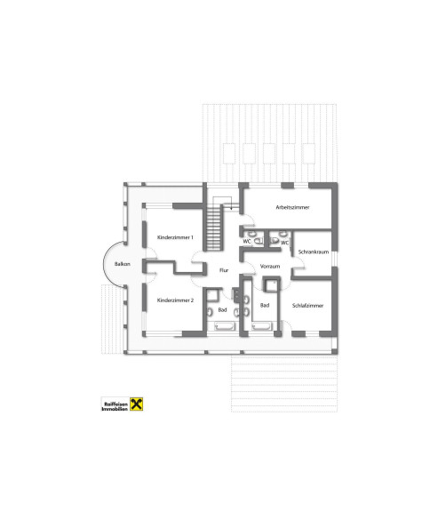 Über die Stiege gelangen Sie zu den insgesamt 3 großen Schlafzimmern, einem Arbeitszimmer und zwei Badezimmern.