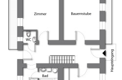Das Haus präsentiert eine Wohnfläche von ca. 137 m² aufgeteilt in 2 Küchen, 4 Zimmer, eine Bauernstube, einen Abstellraum, ein Bad und 2 separate WC´s, verteilt auf 2 Etagen. Hinzu kommt ein kleiner 15m² großer Erdkeller und ein, nicht ausgebautes, Dachgeschoß mit weiterem Stauraum. Aufgrund der beiden zentralen Vorhäuser, die sich über die gesamte Gebäudelänge ziehen, bietet das Bauernhaus die Möglichkeit, in zwei ca. 70m² große Wohneinheiten aufgeteilt zu werden.