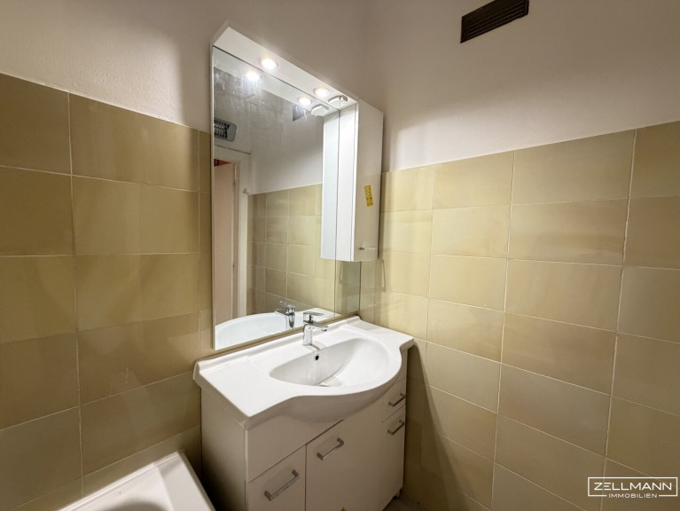 Das Badezimmer ist mit einer Badewanne ausgestattet und die beiden lichtdurchfluteten Zimmer sind vielseitig nutzbar – ob als Wohn- und Schlafzimmer, als Wohnraum mit Home-Office-Bereich oder als praktische Kombination für Paare oder kleine Familien.