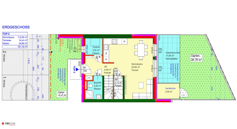 WNFL ca. 107,03 m² (5 Zimmer) + GARTEN ca. 46 m2 + 2 TERRASSEN ca. 17 m2 + 2 PKW Stellplätze ca. 25,50 m² = EUR 479.000 - SCHLÜSSELFERTIG!