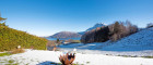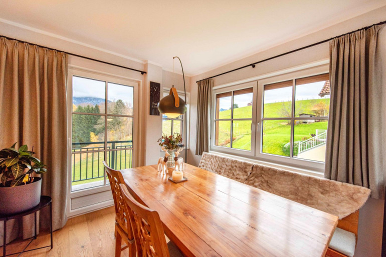 Auf der Hauptebene empfängt Sie ein großzügiger Eingangsbereich, der in das helle Wohnzimmer mit Kachelofen übergeht. Von hier öffnen sich sowohl der vorgelagerte Balkon als auch der Essbereich im Wintergarten – beides Orte, an denen Sie den atemberaubenden Blick über den See und die Berge genießen können.