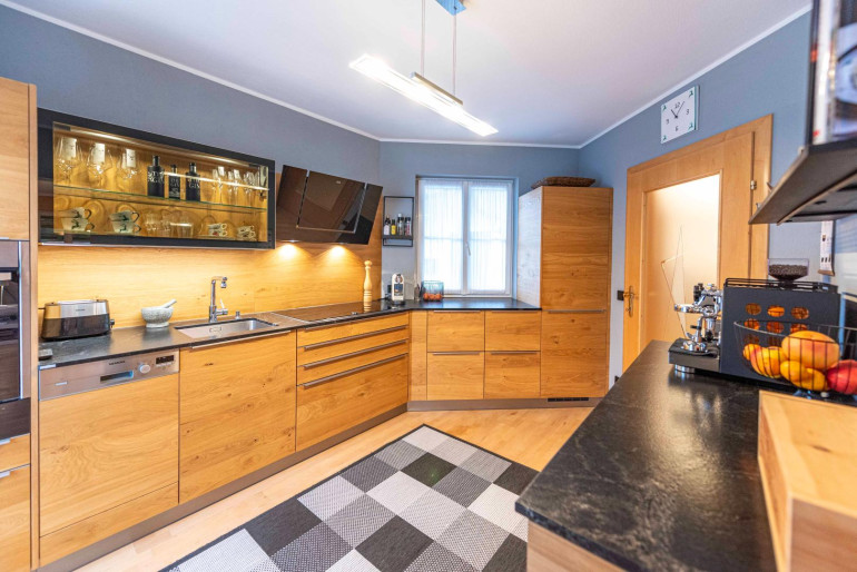 Die neue, hochwertig ausgestattete Küche lädt zum Kochen und Verweilen ein, mit direkten Ausgang auf eine Terrasse.