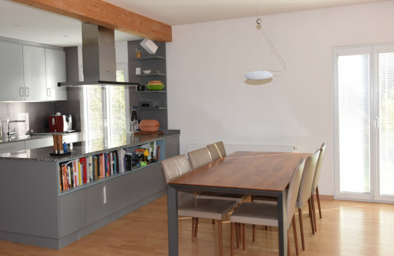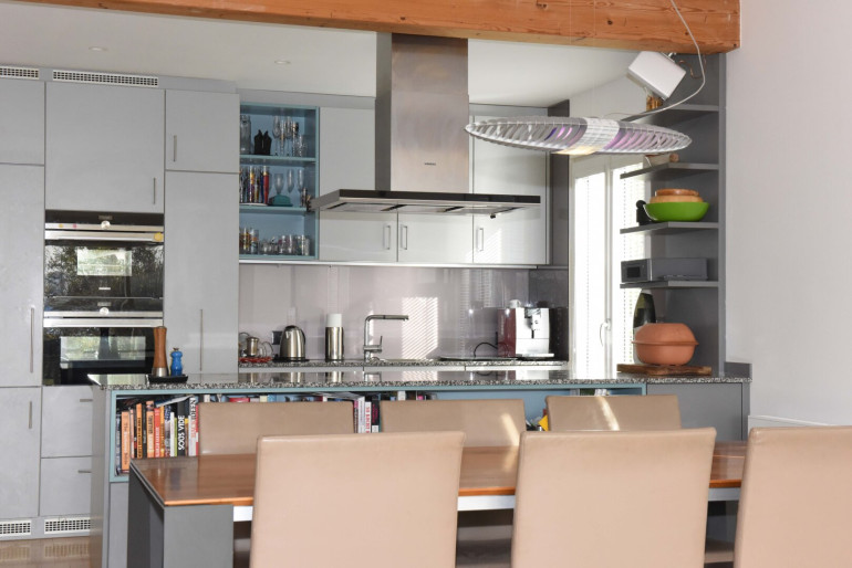 Parkett, Steinboden, Heizofen, Fußbodenheizung, Wohnküche / offene Küche, Südbalkon, Bad mit Fenster, Garage, Sauna, Swimmingpool