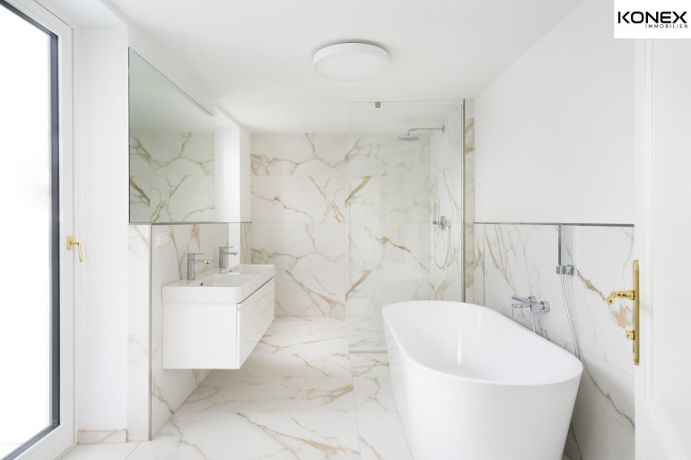 Modernes Badezimmer mit freistehender Badewanne, großem Duschbereich und Doppelwaschtisch