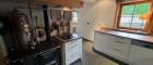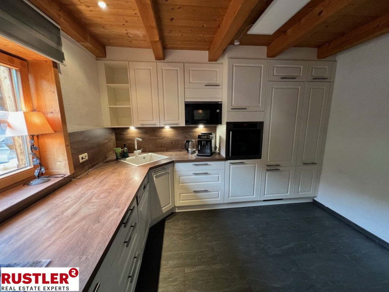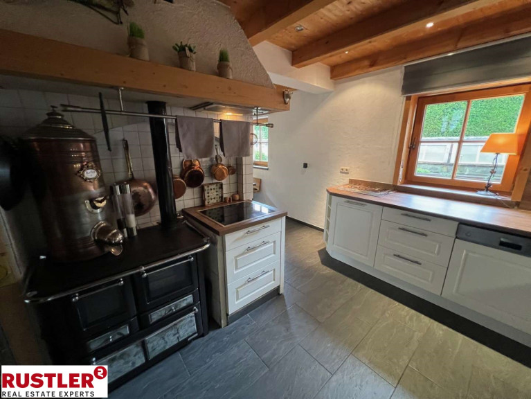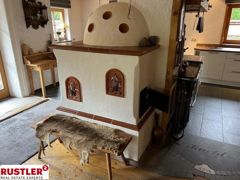 Herzstück des Hauses ist die großzügige, neuwertige Einbauküche, ausgestattet mit einem charmanten Holzofen und ausgewählten Markengeräten – ein stilvoller Ort, an dem Genuss, Geselligkeit und kulinarische Leidenschaft zusammentreffen. Ein imposanter Kachelofen im Wohnbereich erfüllt den Raum an kühlen Tagen mit sanfter, wohliger Strahlungswärme, während die moderne Gasheizung das gesamte Haus effizient beheizt.