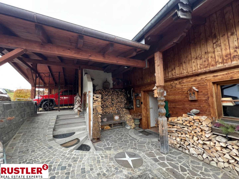 Hochwertige Dielen- und Fliesenböden unterstreichen den alpinen Charakter und verleihen dem Interieur einen edlen, natürlichen Ausdruck. Zwei Carports sowie ein zusätzlicher Außenstellplatz sorgen für komfortable Parkmöglichkeiten, ergänzt durch einen praktischen Abstell- und Wirtschaftsraum.