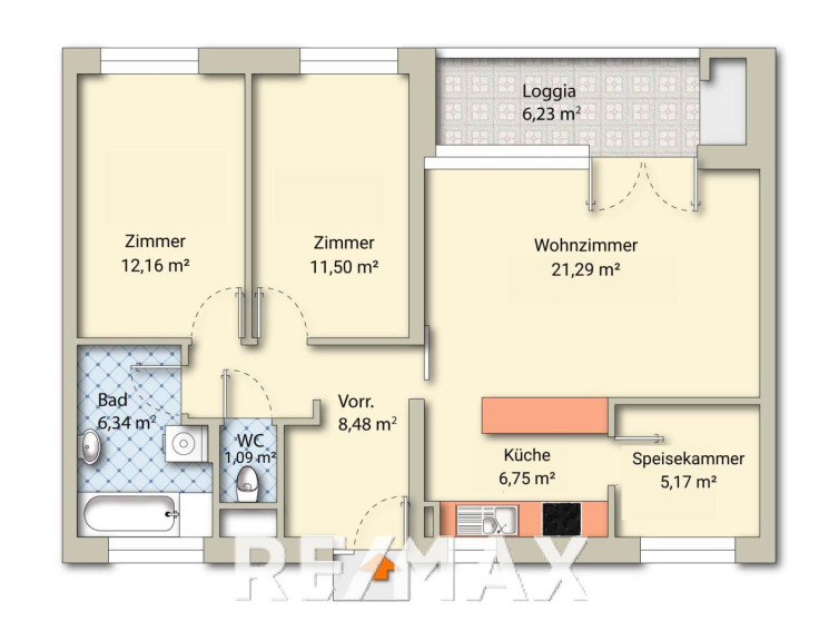 Mit einer Wohnfläche von rund 79m² (Loggia inkl.) bietet die Wohnung ein durchdachtes Raumkonzept mit offener Wohnküche, zwei Schlafzimmern, einem großen Abstellraum, Bad mit Badewanne und separatem WC. Die großzügige, westseitige Loggia (ca. 6m²) lädt zum Entspannen in der Abendsonne ein.