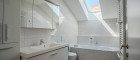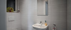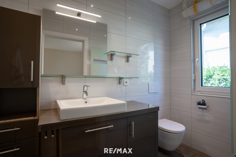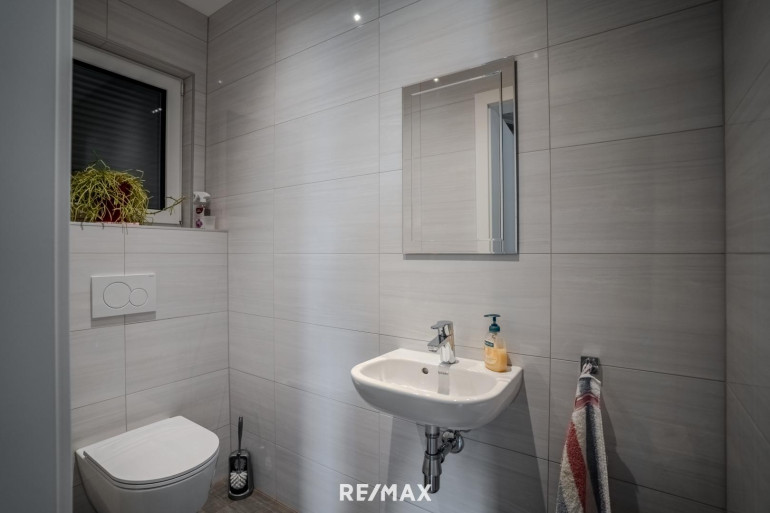 Ein Schlafzimmer, eine begehbare Garderobe sowie ein stilvolles Bad mit Designerwaschtisch und Walk-In Dusche runden das Erdgeschoss ab. Zusätzlich gibt es eine separate Toilette mit Handwaschbecken und einen praktischen Abstellraum.
