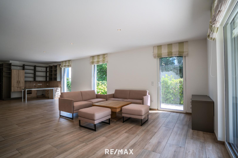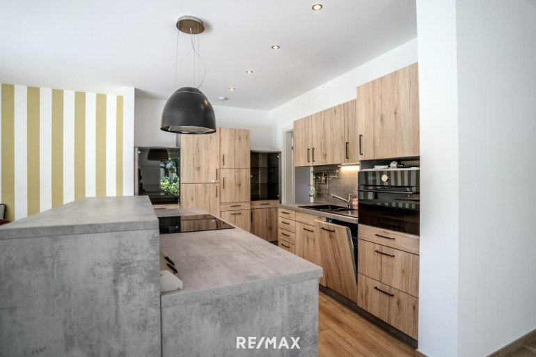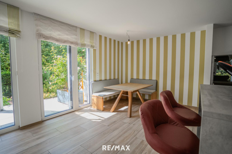 Im Erdgeschoss betreten Sie einen großzügigen Vorraum, der in einen lichtdurchfluteten Wohnsalon mit Essbereich und integrierter offener Küche übergeht. Diese moderne Küche ist mit hochwertigen Geräten ausgestattet und bietet eine Kochinsel mit Barbereich, ideal für gesellige Abende. Von hier aus gelangen Sie auf die Terrasse, die den Blick in den schön angelegten, südseitigen Garten freigibt.