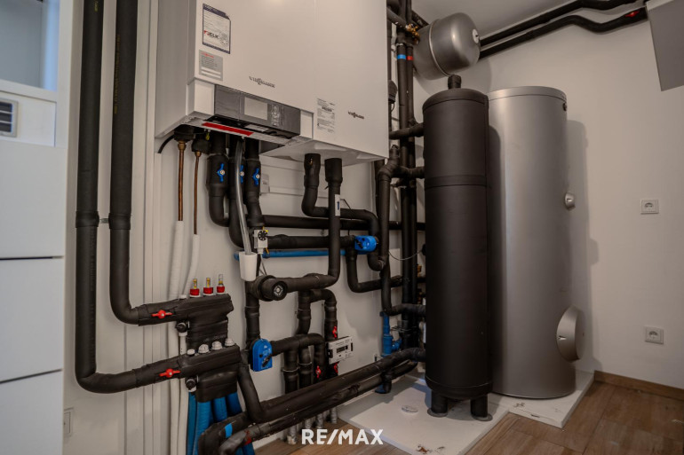 Die Luft-Wärmepumpe von Viessmann gewährleistet eine effiziente Beheizung und Warmwasserbereitung, unterstützt durch eine Fußbodenheizung, die für zusätzliche Behaglichkeit sorgt.