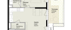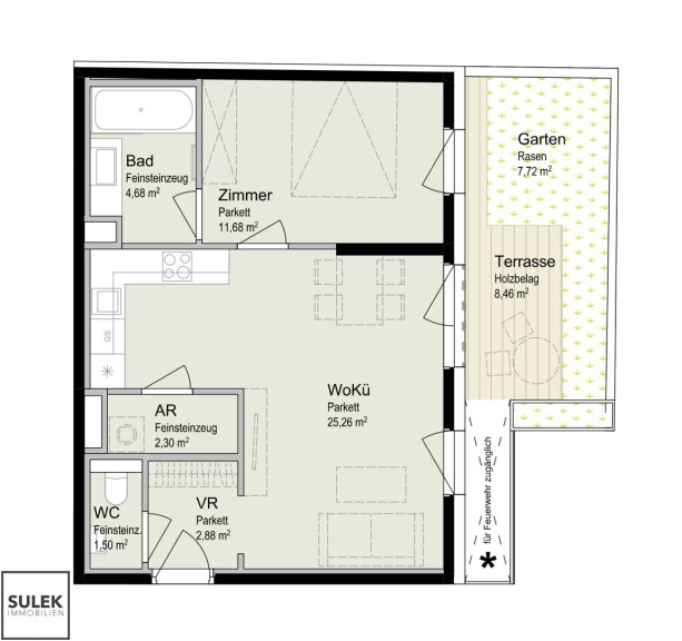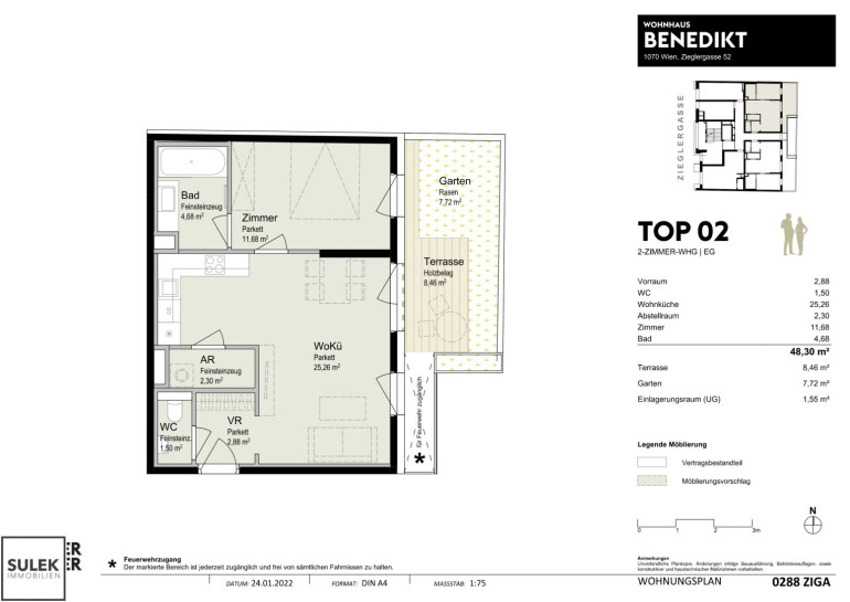 Das Objekt ist situiert im Erdgeschoss und umfasst eine Wohnfläche von ca. 48m², die sich wie folgt aufteilt: