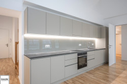 - die große Wohnküche (rd. 28m²) mit vollausgestatteter, zeitloser Küche in beige mit Zugang zur südseitigen Loggia (rd. 15m²),