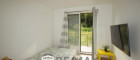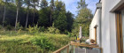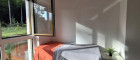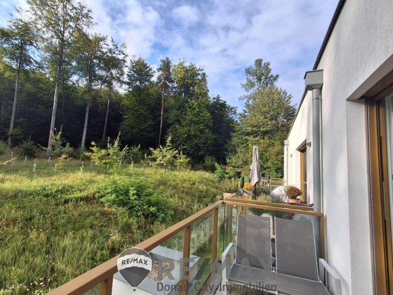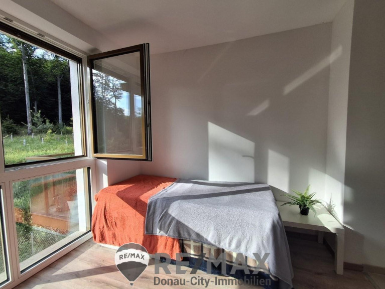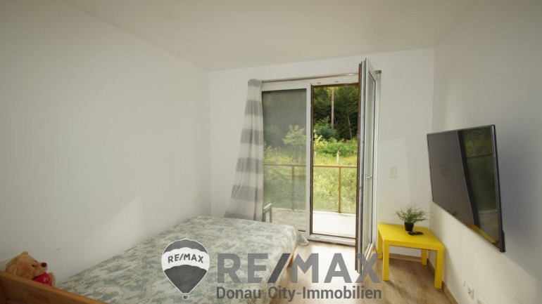 Das Schlafzimmer nebenan bietet Zugang zum verfliesten Balkon mit Sitzbank und Ausblick zu Wald und Wiese und lädt zum Chillen nach der Arbeit mit Sonnenuntergang!