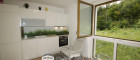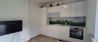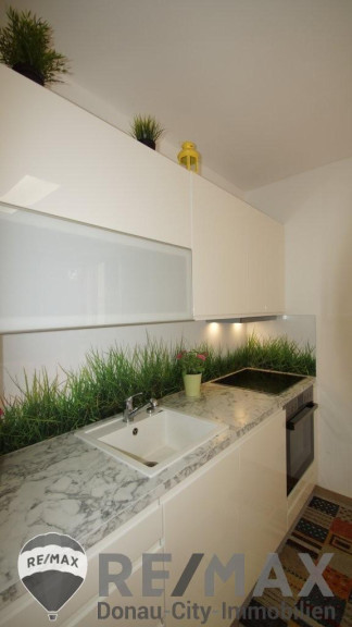 Mit dem Lift fährt man in den 1. Stock und betritt die Wohnung mit Sicherheitstüre vom Gang aus. Vom Vorzimmer gelangt man in die modern eingerichtete Küche mit Spüle, Backofen, Ceranfeld, Dunstabzug, Kühlschrank und Geschirrspüler. Eine Essgarnitur oder bequeme Couch passen locker herein. Momentan steht hier ein Gästebett zusätzlich und ein Relax-Sessel mit Flatscreen.