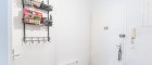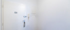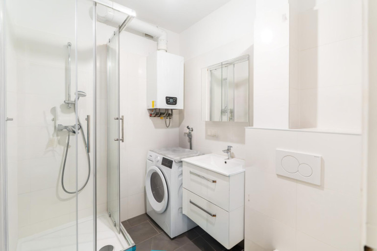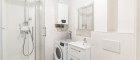 Das neu sanierte Duschbad ist hell verfliest und bietet Platz für die Waschmaschine