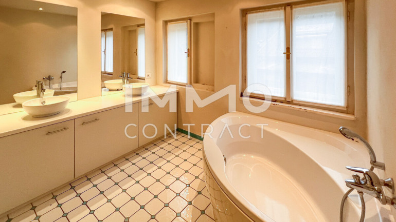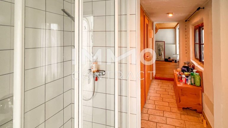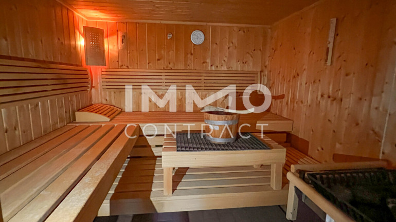 Fliesen, Dielenboden, Zentralheizung, Einbauküche, Badewanne, Dusche, Sauna
