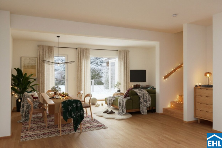 Ein offener, heller Wohn- und Essbereich mit direktem Ausgang auf die Terrasse. Der Garten schließt nahtlos an – ein privater Lieblingsplatz für Frühstück in der Sonne, Spielen im Grünen oder entspannte Abende draußen.