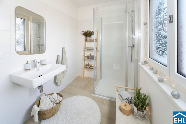 Drei angenehm ruhige Zimmer bieten flexible Nutzungsmöglichkeiten – Schlafräume, Kinderzimmer, Arbeitszimmer oder Gästezimmer. Zwei moderne Bäder ergänzen den durchdachten Grundriss und sorgen für Komfort im Alltag.