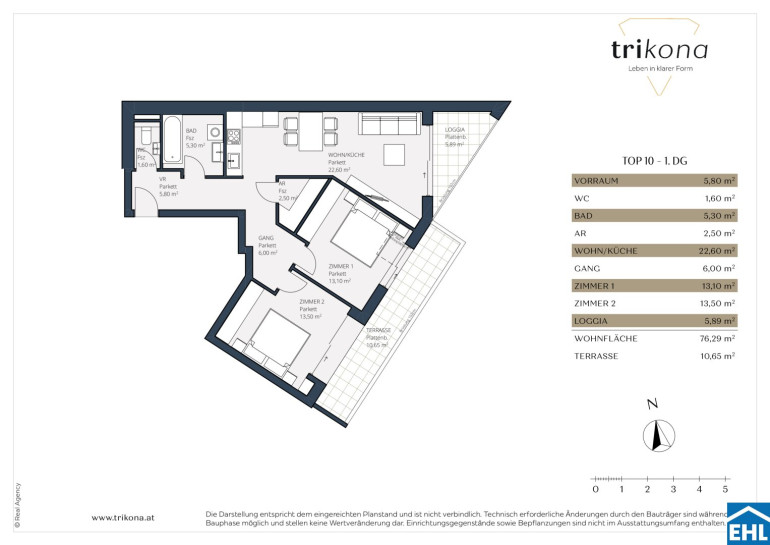 Die hochwertige Ausstattung des Projekts „Trikona“ und die energieeffiziente, innovative Holz-Hybrid-Bauweise spiegeln exzellentes Design und Qualität wider. Zeitlose Unterputzarmaturen der Firma Grohe sorgen für eine elegante Optik und praktische Nutzung. Das Weitzer Echtholzparkett schafft eine warme, natürliche Atmosphäre in den Räumen, während die moderne Smart Home Anlage das Wohnen komfortabel und intelligent macht – von der Steuerung der Beleuchtung bis hin zu Heizung und Sicherheitssystemen. Für Energieeffizienz sorgen eine Wärmepumpe mit Fußbodenheizung sowie eine innovative Kühlung via Roll Over System, die das ganze Jahr über für angenehme Temperaturen sorgt. Hochwertige Feinsteinfliesen im Badezimmer und in der Küche verleihen den Räumen einen eleganten, pflegeleichten Look. Echtholzböden ergänzen das harmonische Gesamtbild und unterstreichen die Qualität der Ausstattung. Besonders hervorzuheben ist, dass alle verwendeten Materialien, Marken und Subunternehmen aus Österreich stammen. Damit wird nicht nur höchste Qualität garantiert, sondern auch die lokale Wirtschaft nachhaltig unterstützt. Diese Kombination aus österreichischer Handwerkskunst, Ästhetik und Funktionalität macht das Wohnerlebnis in „Trikona“ einzigartig.