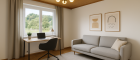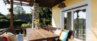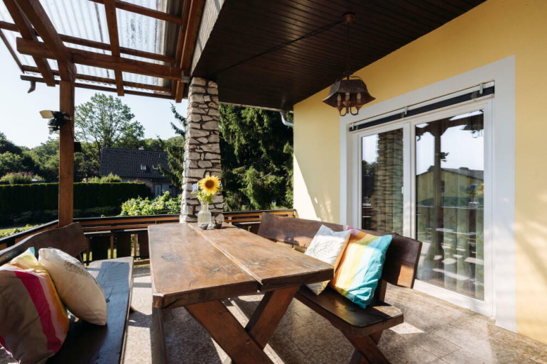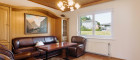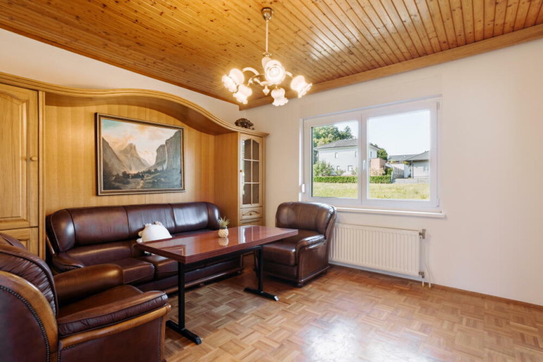 - Wohnzimmer mit Fensterfront und Zugang auf die süd-östlich ausgerichtete Terrasse (überdacht)