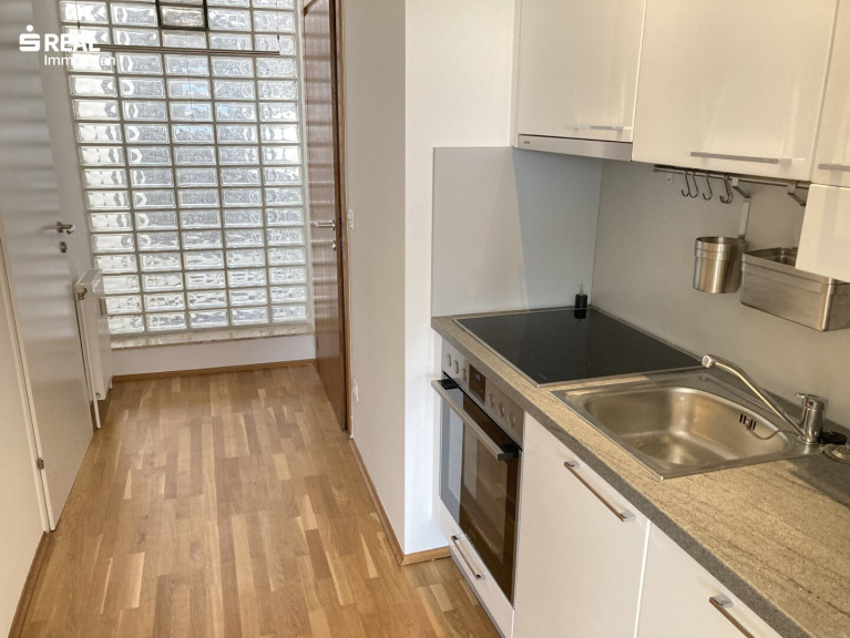 Die helle Wohnung teilt sich wie folgt auf: Vorraum mit Einbauküche, Ess-Erker, Bad mit Dusche & WC, heller Wohn/Schlafraum.