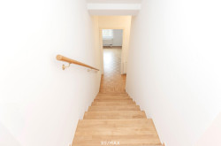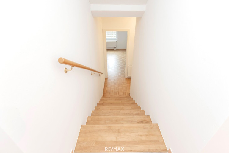 Der Vorraum bringt Sie über einen Stiegenabgang auf die zweite Ebene, wo Sie zwei nord-ost-seitige Zimmer (ca. 12 m² und ca. 14 m²), das Bad mit Badewanne und Fenster sowie den Abstellraum vorfinden.