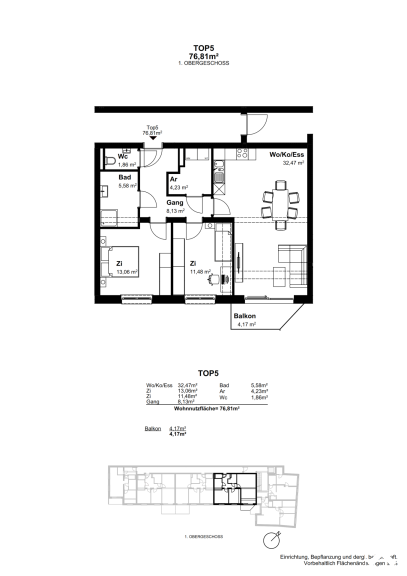 Die Wohnungen bieten 18–76 m² Wohnnutzfläche und verfügen je nach Einheit über Balkon, Terrasse, Wohnterrasse oder Eigengarten. Jede Wohnung erhält ein eigenes Kellerabteil. Insgesamt stehen 24 PKW-Stellplätze sowie ein Kinderspielplatz im begrünten Außenbereich zur Verfügung.