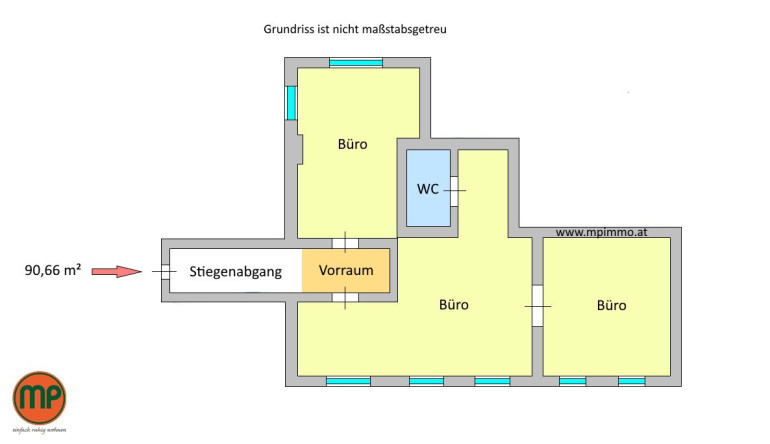 Bereits das großzügige Vorzimmer bietet viel Platz für Stauraum oder einen repräsentativen Empfangsbereich. Von hier aus gelangt man in einen größeren Hauptbürobereich und weiter in einen kleineren, separat abgetrennten Raum.