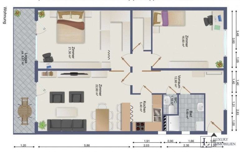 Eine geräumige Loggia mit ca. 8 m² und angenehmem Blick auf die Kahlenberger Hügel – ein idealer Ort zum Entspannen im Freien