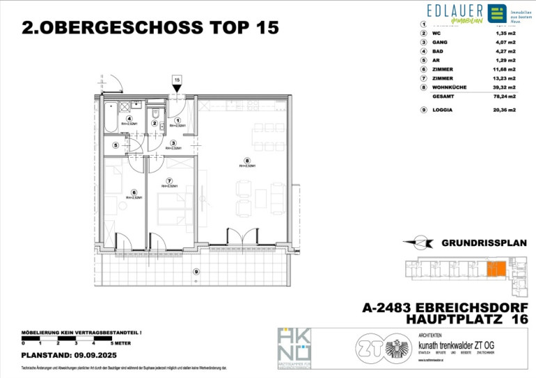 Moderner Neubau in Top Lage! PROJEKT In einer exklusiven Wohnanlage entstehen insgesamt 24 hochwertig ausgestattete Wohnungen – in einem architektonisch ansprechenden Gebäude mit vier Obergeschossen und Unterkellerung. Die Wohnungen verfügen über Wohnflächen zwischen ca. 67,83 m² und 123,69 m² und bieten großzügige Loggien oder Balkone mit schönem Grünblick – einige Einheiten auch mit Terrasse oder kleinem Gartenanteil. Für den ruhenden Verkehr stehen insgesamt 42 Stellplätze in der hauseigenen Garage zur Verfügung. LAGE Die Liegenschaft befindet sich am Hauptplatz 16 in Ebreichsdorf und überzeugt durch ihre hervorragende Lage, die urbanen Komfort mit naturnahem Wohnen vereint. In unmittelbarer Umgebung stehen vielfältige Freizeit- und Erholungsmöglichkeiten, Schulen sowie zahlreiche Einkaufsmöglichkeiten für den täglichen Bedarf zur Verfügung. Die gelungene Kombination aus zentraler Lage und ruhigem Wohnumfeld macht diese Immobilie besonders attraktiv. AUSSTATTUNG – Vielseitiges Angebot an Wohnungstypen – Freiflächen für jede Wohnung – Küchen sind vollausgestattet – Großformatfliesen in Badezimmer/WC mit moderner Sanitärausstattung – Echtholz-Parkett – Fußbodenheizung – Klimaanlagen im DG – elektrische Außenjalousien RAUMAUFTEILUNGEN Die Wohnungen verfügen über Wohnflächen zwischen ca. 67,83 m² und 123,69 m² und bieten großzügige Loggien oder Balkone mit schönem Grünblick – einige Einheiten auch mit Terrasse oder kleinem Gartenanteil. Es besteht die Möglichkeit Stellplätze in der hauseigenen Tiefgarage anzumieten. Zusätzlich wird dem Mieter auch ein Kellerabteil zur prekaristischen Nutzung zur Verfügung gestellt. BEHEIZUNG: Die Beheizung und Warmwasseraufbereitung der Wohnhausanlage erfolgt mittels Luft-Wasser Wärmepumpe. (das Heizkostenakonto wird mit 0,50€/m² angesetzt) NEBENKOSTEN: Die Kaution in Höhe von 3 Bruttomonatsmieten muss spätestens bei Vertragsunterzeichnung erlegt werden. VERTRAGSKONDITIONEN: Der Mietvertrag wird auf einen Zeitraum von 5 Jahren befristet. Eine Kündigung seitens des Mieters ist frühestens nach Ablauf eines Jahres unter Einhaltung einer dreimonatigen Kündigungsfrist möglich. PARKPLÄTZE In der hauseigenen Tiefgarage stehen insgesamt 42 Stellplätze zur Verfügung welche separat angemietet werden können. Kosten monatlich: 55,00 € zzgl. Betriebskosten und gesetzlicher Umsatzsteuer FERTIGSTELLUNG Die Wohnungen werden im Dezember 2025 fertigstellt werden. BESICHTIGUNG Eine Besichtigung ist nach vorheriger Terminvereinbarung selbstverständlich möglich. ENERGIEKENNZAHL Die Liegenschaft besitzt die Kennzahl B-A bei einem Heizwärmebedarf (HWB) von 28,48 kWh/m² und einem Gesamt-Energieeffizienz-Faktor (fGEE) von 0,68. Hinweis auf Naheverhältnis Wir weisen darauf hin, dass zum Verkäufer ein wirtschaftliches Naheverhältnis besteht (wiederholte Beauftragungen). OBJEKTNUMMER 8109 Halten Sie bitte bei telefonischen Auskünften diese Objektnummer bereit. Wir ersuchen aus organisatorischen Gründen (Datenbankpflege) und aufgrund unserer Nachweispflicht gegenüber dem Abgeber um vollständige Angabe Ihrer Kontaktdaten einschließlich Vor- und Zuname, Adresse und Telefonnummer. Der Schutz Ihrer personenbezogenen Daten ist uns ein großes Anliegen. Wir verwenden Ihre Daten für die Interessenten- und Kundenverwaltung im Rahmen der Immobilienvermittlung (z.B. für die Zusendung von Immobilienangeboten). Die Rechtsgrundlage dafür bildet – sofern nicht eine gesetzliche Grundlage vorliegt – ein abgeschlossener Vertrag bzw. eine Vertragsanbahnung (Vermittlungsvertrag). Die Weitergabe personenbezogener Daten erfolgt ohne ausdrückliche separate Einwilligung nur insoweit, wie es für Vertragsabwicklungen erforderlich ist. Keinesfalls werden Ihre Daten zu Werbezwecken o.ä. weitergegeben. Unsere Mitarbeiter und unsere Dienstleistungsunternehmen sind zur Verschwiegenheit und zur Einhaltung der Datenschutzbestimmungen verpflichtet. Lesen Sie mehr in unserer Datenschutzerklärung auf unserer Homepage.