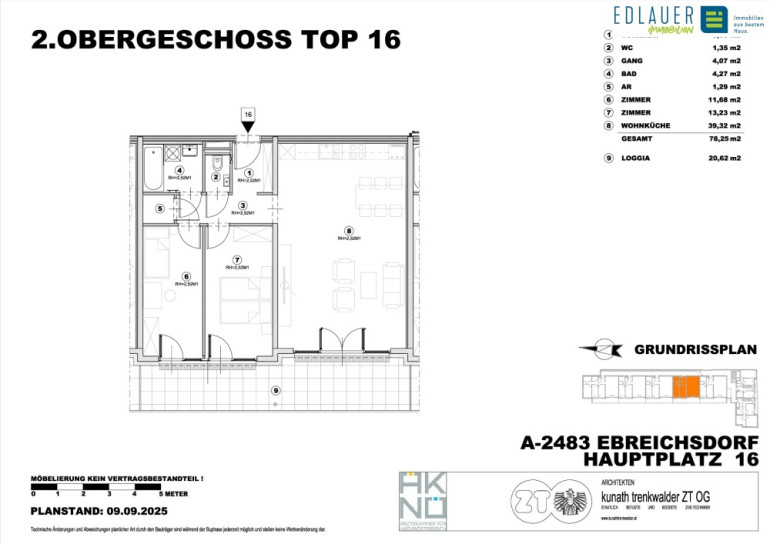 Moderner Neubau in Top Lage! PROJEKT In einer exklusiven Wohnanlage entstehen insgesamt 24 hochwertig ausgestattete Wohnungen – in einem architektonisch ansprechenden Gebäude mit vier Obergeschossen und Unterkellerung. Die Wohnungen verfügen über Wohnflächen zwischen ca. 67,83 m² und 123,69 m² und bieten großzügige Loggien oder Balkone mit schönem Grünblick – einige Einheiten auch mit Terrasse oder kleinem Gartenanteil. Für den ruhenden Verkehr stehen insgesamt 42 Stellplätze in der hauseigenen Garage zur Verfügung. LAGE Die Liegenschaft befindet sich am Hauptplatz 16 in Ebreichsdorf und überzeugt durch ihre hervorragende Lage, die urbanen Komfort mit naturnahem Wohnen vereint. In unmittelbarer Umgebung stehen vielfältige Freizeit- und Erholungsmöglichkeiten, Schulen sowie zahlreiche Einkaufsmöglichkeiten für den täglichen Bedarf zur Verfügung. Die gelungene Kombination aus zentraler Lage und ruhigem Wohnumfeld macht diese Immobilie besonders attraktiv. AUSSTATTUNG – Vielseitiges Angebot an Wohnungstypen – Freiflächen für jede Wohnung – Küchen sind vollausgestattet – Großformatfliesen in Badezimmer/WC mit moderner Sanitärausstattung – Echtholz-Parkett – Fußbodenheizung – Klimaanlagen im DG – elektrische Außenjalousien RAUMAUFTEILUNGEN Die Wohnungen verfügen über Wohnflächen zwischen ca. 67,83 m² und 123,69 m² und bieten großzügige Loggien oder Balkone mit schönem Grünblick – einige Einheiten auch mit Terrasse oder kleinem Gartenanteil. Es besteht die Möglichkeit Stellplätze in der hauseigenen Tiefgarage anzumieten. Zusätzlich wird dem Mieter auch ein Kellerabteil zur prekaristischen Nutzung zur Verfügung gestellt. BEHEIZUNG: Die Beheizung und Warmwasseraufbereitung der Wohnhausanlage erfolgt mittels Luft-Wasser Wärmepumpe. (das Heizkostenakonto wird mit 0,50€/m² angesetzt) NEBENKOSTEN: Die Kaution in Höhe von 3 Bruttomonatsmieten muss spätestens bei Vertragsunterzeichnung erlegt werden. VERTRAGSKONDITIONEN: Der Mietvertrag wird auf einen Zeitraum von 5 Jahren befristet. Eine Kündigung seitens des Mieters ist frühestens nach Ablauf eines Jahres unter Einhaltung einer dreimonatigen Kündigungsfrist möglich. PARKPLÄTZE In der hauseigenen Tiefgarage stehen insgesamt 42 Stellplätze zur Verfügung welche separat angemietet werden können. Kosten monatlich: 55,00 € zzgl. Betriebskosten und gesetzlicher Umsatzsteuer FERTIGSTELLUNG Die Wohnungen werden im Dezember 2025 fertigstellt werden. BESICHTIGUNG Eine Besichtigung ist nach vorheriger Terminvereinbarung selbstverständlich möglich. ENERGIEKENNZAHL Die Liegenschaft besitzt die Kennzahl B-A bei einem Heizwärmebedarf (HWB) von 28,48 kWh/m² und einem Gesamt-Energieeffizienz-Faktor (fGEE) von 0,68. Hinweis auf Naheverhältnis Wir weisen darauf hin, dass zum Verkäufer ein wirtschaftliches Naheverhältnis besteht (wiederholte Beauftragungen). OBJEKTNUMMER 8109 Halten Sie bitte bei telefonischen Auskünften diese Objektnummer bereit. Wir ersuchen aus organisatorischen Gründen (Datenbankpflege) und aufgrund unserer Nachweispflicht gegenüber dem Abgeber um vollständige Angabe Ihrer Kontaktdaten einschließlich Vor- und Zuname, Adresse und Telefonnummer. Der Schutz Ihrer personenbezogenen Daten ist uns ein großes Anliegen. Wir verwenden Ihre Daten für die Interessenten- und Kundenverwaltung im Rahmen der Immobilienvermittlung (z.B. für die Zusendung von Immobilienangeboten). Die Rechtsgrundlage dafür bildet – sofern nicht eine gesetzliche Grundlage vorliegt – ein abgeschlossener Vertrag bzw. eine Vertragsanbahnung (Vermittlungsvertrag). Die Weitergabe personenbezogener Daten erfolgt ohne ausdrückliche separate Einwilligung nur insoweit, wie es für Vertragsabwicklungen erforderlich ist. Keinesfalls werden Ihre Daten zu Werbezwecken o.ä. weitergegeben. Unsere Mitarbeiter und unsere Dienstleistungsunternehmen sind zur Verschwiegenheit und zur Einhaltung der Datenschutzbestimmungen verpflichtet. Lesen Sie mehr in unserer Datenschutzerklärung auf unserer Homepage.