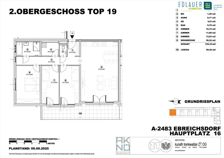 Moderner Neubau in Top Lage! PROJEKT In einer exklusiven Wohnanlage entstehen insgesamt 24 hochwertig ausgestattete Wohnungen – in einem architektonisch ansprechenden Gebäude mit vier Obergeschossen und Unterkellerung. Die Wohnungen verfügen über Wohnflächen zwischen ca. 67,83 m² und 123,69 m² und bieten großzügige Loggien oder Balkone mit schönem Grünblick – einige Einheiten auch mit Terrasse oder kleinem Gartenanteil. Für den ruhenden Verkehr stehen insgesamt 42 Stellplätze in der hauseigenen Garage zur Verfügung. LAGE Die Liegenschaft befindet sich am Hauptplatz 16 in Ebreichsdorf und überzeugt durch ihre hervorragende Lage, die urbanen Komfort mit naturnahem Wohnen vereint. In unmittelbarer Umgebung stehen vielfältige Freizeit- und Erholungsmöglichkeiten, Schulen sowie zahlreiche Einkaufsmöglichkeiten für den täglichen Bedarf zur Verfügung. Die gelungene Kombination aus zentraler Lage und ruhigem Wohnumfeld macht diese Immobilie besonders attraktiv. AUSSTATTUNG – Vielseitiges Angebot an Wohnungstypen – Freiflächen für jede Wohnung – Küchen sind vollausgestattet – Großformatfliesen in Badezimmer/WC mit moderner Sanitärausstattung – Echtholz-Parkett – Fußbodenheizung – Klimaanlagen im DG – elektrische Außenjalousien RAUMAUFTEILUNGEN Die Wohnungen verfügen über Wohnflächen zwischen ca. 67,83 m² und 123,69 m² und bieten großzügige Loggien oder Balkone mit schönem Grünblick – einige Einheiten auch mit Terrasse oder kleinem Gartenanteil. Es besteht die Möglichkeit Stellplätze in der hauseigenen Tiefgarage anzumieten. Zusätzlich wird dem Mieter auch ein Kellerabteil zur prekaristischen Nutzung zur Verfügung gestellt. BEHEIZUNG: Die Beheizung und Warmwasseraufbereitung der Wohnhausanlage erfolgt mittels Luft-Wasser Wärmepumpe. (das Heizkostenakonto wird mit 0,50€/m² angesetzt) NEBENKOSTEN: Die Kaution in Höhe von 3 Bruttomonatsmieten muss spätestens bei Vertragsunterzeichnung erlegt werden. VERTRAGSKONDITIONEN: Der Mietvertrag wird auf einen Zeitraum von 5 Jahren befristet. Eine Kündigung seitens des Mieters ist frühestens nach Ablauf eines Jahres unter Einhaltung einer dreimonatigen Kündigungsfrist möglich. PARKPLÄTZE In der hauseigenen Tiefgarage stehen insgesamt 42 Stellplätze zur Verfügung welche separat angemietet werden können. Kosten monatlich: 55,00 € zzgl. Betriebskosten und gesetzlicher Umsatzsteuer FERTIGSTELLUNG Die Wohnungen werden im Dezember 2025 fertigstellt werden. BESICHTIGUNG Eine Besichtigung ist nach vorheriger Terminvereinbarung selbstverständlich möglich. ENERGIEKENNZAHL Die Liegenschaft besitzt die Kennzahl B-A bei einem Heizwärmebedarf (HWB) von 28,48 kWh/m² und einem Gesamt-Energieeffizienz-Faktor (fGEE) von 0,68. Hinweis auf Naheverhältnis Wir weisen darauf hin, dass zum Verkäufer ein wirtschaftliches Naheverhältnis besteht (wiederholte Beauftragungen). OBJEKTNUMMER 8109 Halten Sie bitte bei telefonischen Auskünften diese Objektnummer bereit. Wir ersuchen aus organisatorischen Gründen (Datenbankpflege) und aufgrund unserer Nachweispflicht gegenüber dem Abgeber um vollständige Angabe Ihrer Kontaktdaten einschließlich Vor- und Zuname, Adresse und Telefonnummer. Der Schutz Ihrer personenbezogenen Daten ist uns ein großes Anliegen. Wir verwenden Ihre Daten für die Interessenten- und Kundenverwaltung im Rahmen der Immobilienvermittlung (z.B. für die Zusendung von Immobilienangeboten). Die Rechtsgrundlage dafür bildet – sofern nicht eine gesetzliche Grundlage vorliegt – ein abgeschlossener Vertrag bzw. eine Vertragsanbahnung (Vermittlungsvertrag). Die Weitergabe personenbezogener Daten erfolgt ohne ausdrückliche separate Einwilligung nur insoweit, wie es für Vertragsabwicklungen erforderlich ist. Keinesfalls werden Ihre Daten zu Werbezwecken o.ä. weitergegeben. Unsere Mitarbeiter und unsere Dienstleistungsunternehmen sind zur Verschwiegenheit und zur Einhaltung der Datenschutzbestimmungen verpflichtet. Lesen Sie mehr in unserer Datenschutzerklärung auf unserer Homepage.