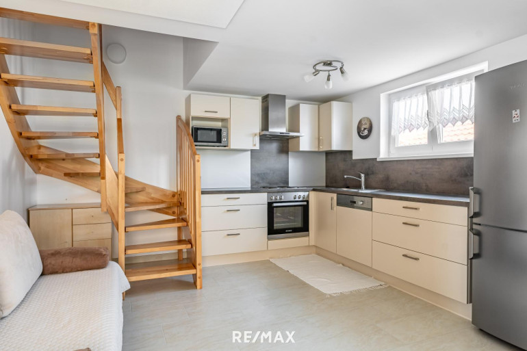 Die Nutzfläche beträgt etwa 60 m² und verteilt sich auf das Erdgeschoss und das Dachgeschoss.