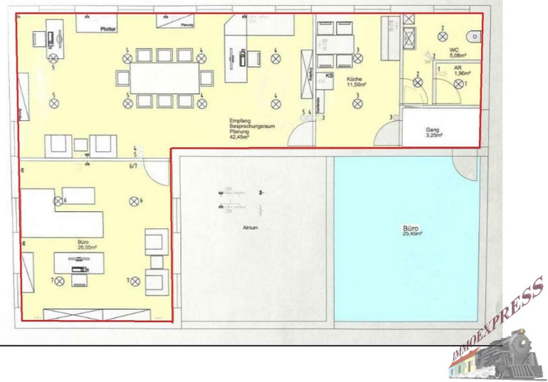 Neben einem Großraum mit ca. 42 qm stehen ein Chef-Büro mit ca. 26 qm und eine eingerichtete Büroküche sowie moderne Sanitäranlagen zur Verfügung.