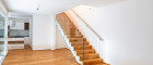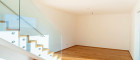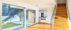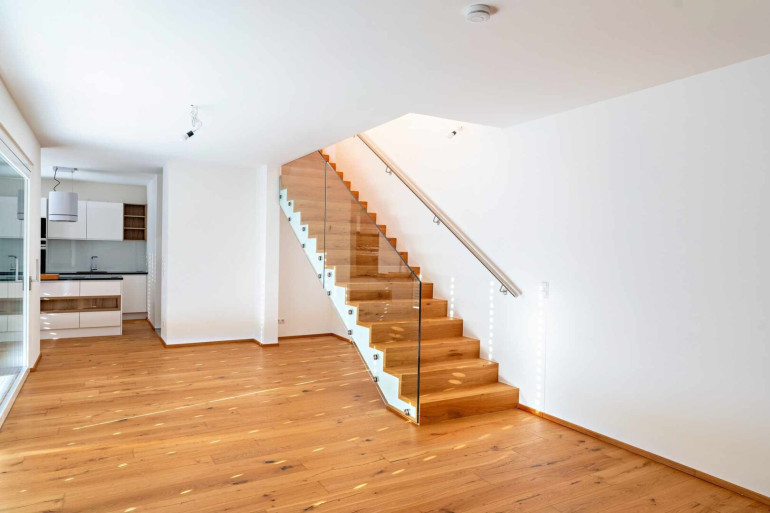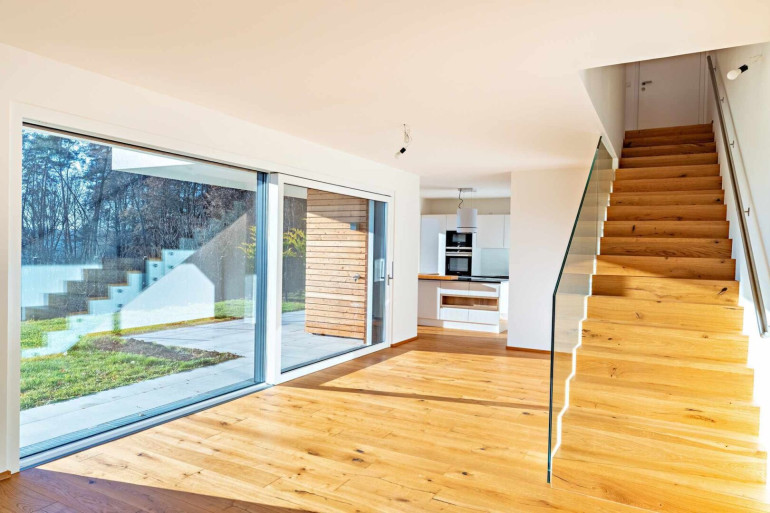 Das anschließende ca. 30 m² große Wohn-/Esszimmer beeindruckt mit einer breiten Fensterfront und einer Hebe-Schiebetür, die direkt auf die Terrasse und in den Garten führt. Der offene Treppenaufgang mit elegantem Glasgeländer setzt einen architektonischen Akzent.