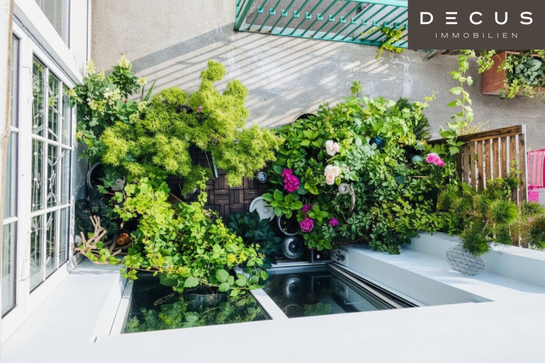 Der begrünte Innenhof ist ein städtisches Kleinod, das mitten in Wien eine Oase der Stille schafft. Ein charmanter, kleiner Rückzugsort mit üppiger Bepflanzung aus Feigenbaum, Rosen, Hortensien, Klematis, Lavendel, Pfingstrosen, Schneerosen, Efeu & mehr.