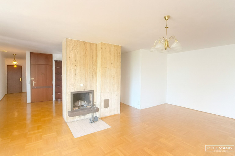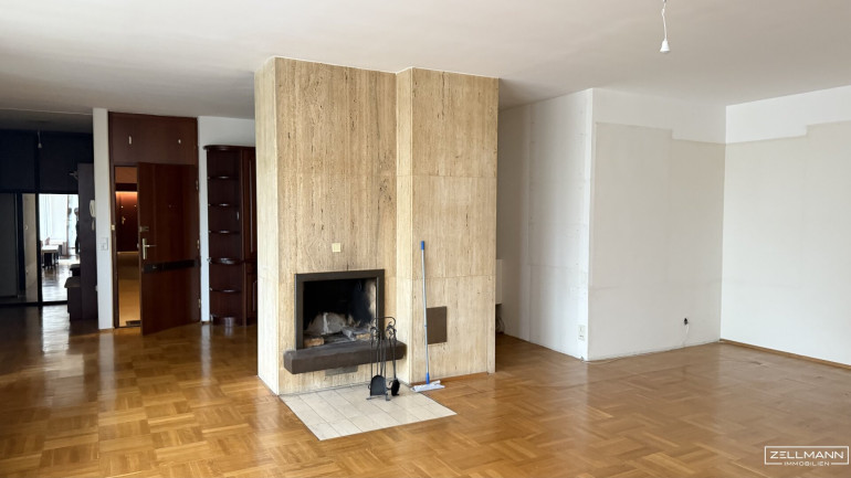 Repräsentatives Wohnzimmer von ca. 45 m² mit offenem Kamin und direktem Zugang zur ca. 11 m² großen Terrasse mit Wienblick