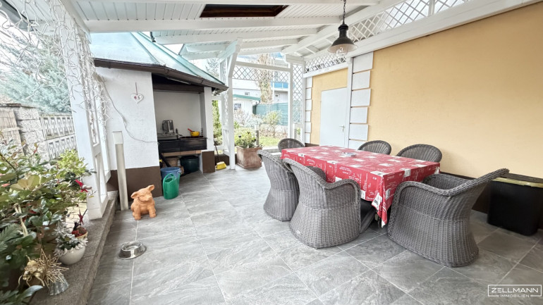 Besonders beeindruckend ist die sehr große, teilweise überdachte Terrasse, die den Wohnraum stilvoll nach draußen erweitert. Sie bietet sowohl sonnige als auch geschützte Bereiche und schafft somit ideale Voraussetzungen für Frühstück an der frischen Luft, sommerliche Dinnerabende, ruhige Nachmittage oder gesellige Grillrunden.