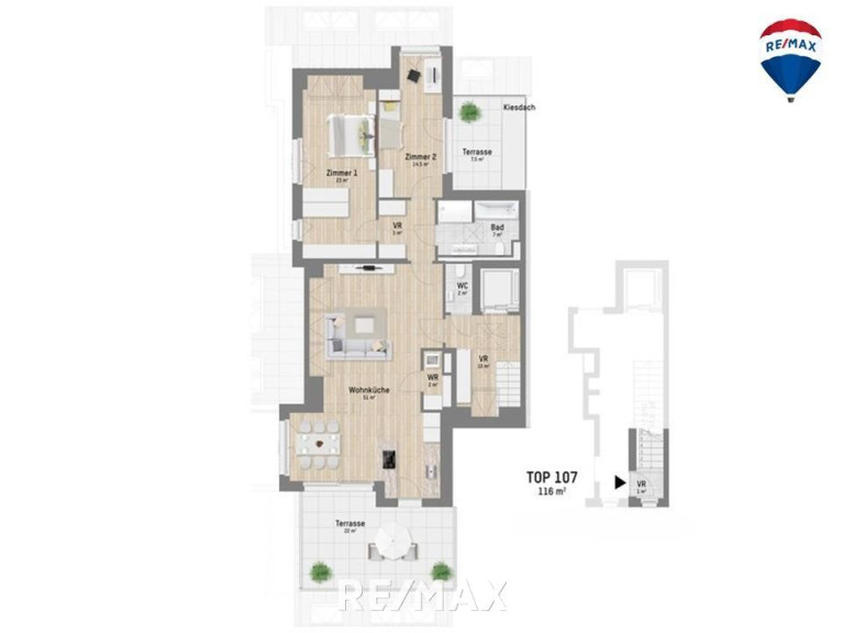 Diese exklusive 3-Zimmer-Wohnung mit zwei Terrassen im 2. Dachgeschoß verfügt insgesamt über ca.116 m² Wohnnutzfläche. Mit dem Aufzug gelangen Sie direkt in Ihre Wohnung. Das Herz der Wohnung bildet die ca. 51 m² große Wohnküche. Von hier aus haben Sie Zugang zu der ca. 22m² großen südwestlich ausgerichteten Terrasse und können bei schönem Wetter Ihren Wohnbereich direkt nach draußen erweitern.