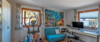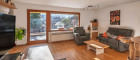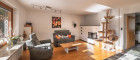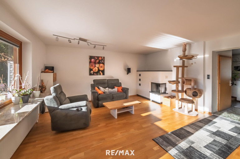 • Großer zentraler Wohnraum mit Kachelofen und Blick in den Garten