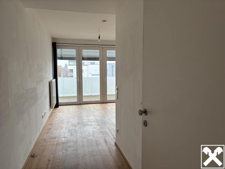 ca 24,97 m2: ein kompakter Raum (Parkettboden) mit Kochnische und Vorraum, Badzimmer und Balkon.