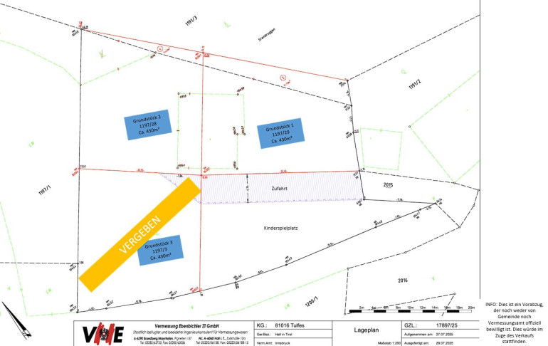 Zum Verkauf steht eine wunderschöne Grundstückfläche in traumhafter Lage mit jeweils 430m² Fläche. Der Baugrund ist in der Volderwaldstraße 9, 6075 Tulfes. Neben sehr guter Verkehrsanbindung und familienfreundlicher Gegend befindet sich der Kinderspielplatz sowie auch der Wald direkt vor der eigenen Haustüre. Sämtliche Ver- und Entsorgungseinrichtungen sind bereits vorhanden. Zudem sind die Flächen an die öffentliche Wasser-, Kanal-, Strom- und Telefonversorgung angeschlossen. Der Altbestand wird von der Verkäuferseite abgerissen.