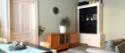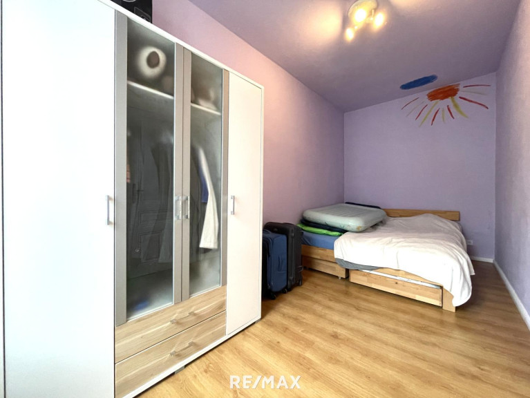 Das Wohnzimmer bietet ein großzügiges Raumgefühl und eignet sich ideal als Wohn- und Aufenthaltsbereich. Das angrenzende Schlafzimmer ermöglicht eine ruhige Rückzugsmöglichkeit und bietet Platz für ein Doppelbett sowie zusätzlichen Stauraum.