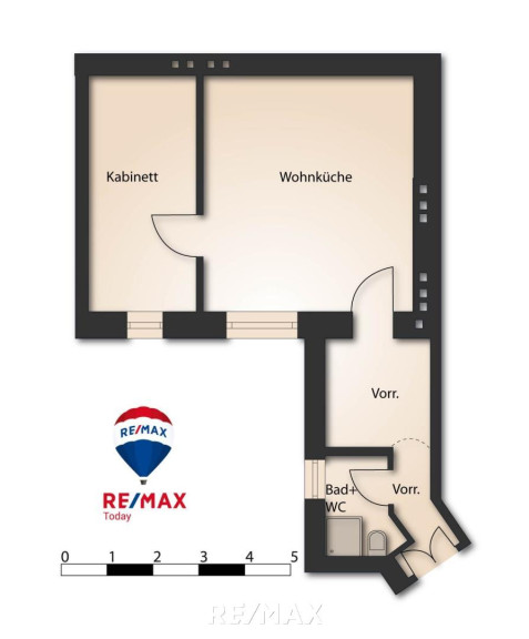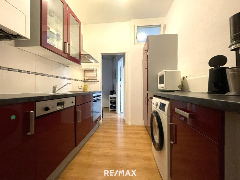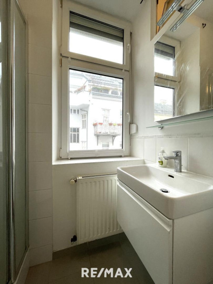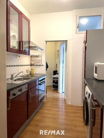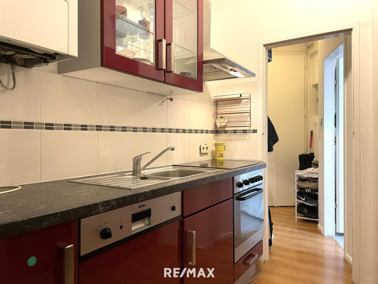 Beim Betreten der Wohnung gelangt man in einen Vorraum, von dem aus das Badezimmer und die Küche begehbar sind. Die Küche ist funktional ausgestattet und bietet ausreichend Platz zum Kochen und für alltägliche Haushaltsabläufe. Das Badezimmer verfügt über eine moderne Dusche, sowie ein WC und ist in gutem Zustand.