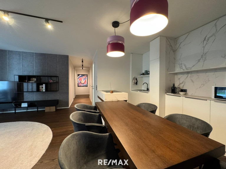 Die hochwertigen Böden aus Parkett und Fliesen verleihen der Wohnung ein modernes und stilvolles Ambiente. Die 3-Zimmer-Wohnung ist mit hochwertigen Möbeln, wie auf den Fotos ersichtlich, komplett ausgestattet. Das Mobiliar ist im Mietpreis inkludiert.